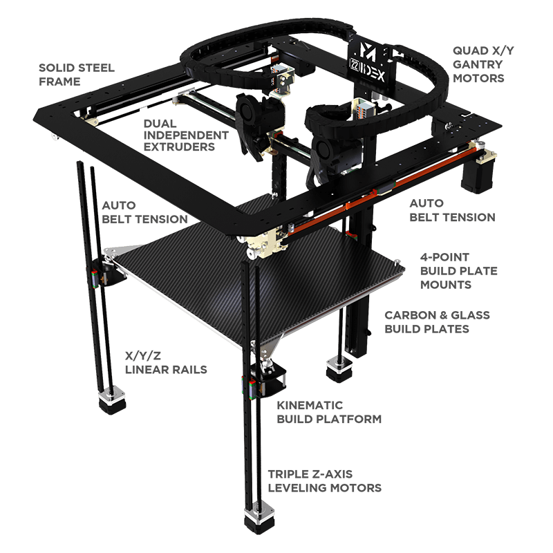 True Self-Leveling Build Platform Never manually level your bed again. Triple Z-Axis motors enable true self-leveling of the build platform, combined with 128-point+ mesh leveling (technically unlimited points), so the hotends will compensate for any variation in the build surface. On top of that (literally), the QUAD-motor XY gantry squares itself -- your parts will maintain accuracy over time, without having to constantly recalibrate.